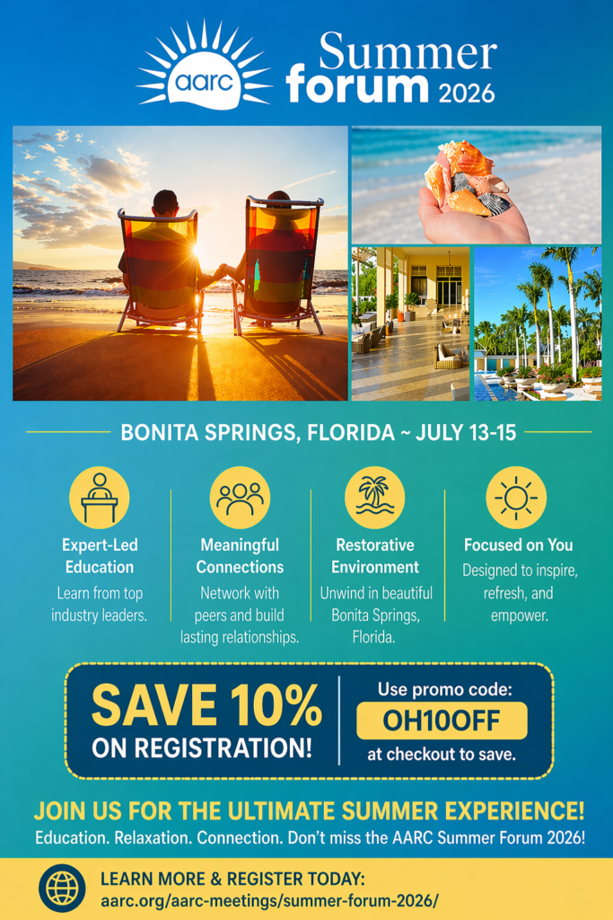 Summer Forum 2026 takes place on July 13–15 (Mon-Wed) in Bonita Springs, FL. This year’s event promises unprecedented learning and networking opportunities full of fun and sun. Mark your calendar today! https://www.aarc.org/events-and-programs/aarc-summer-forum/Exhibit at AARC Events!
