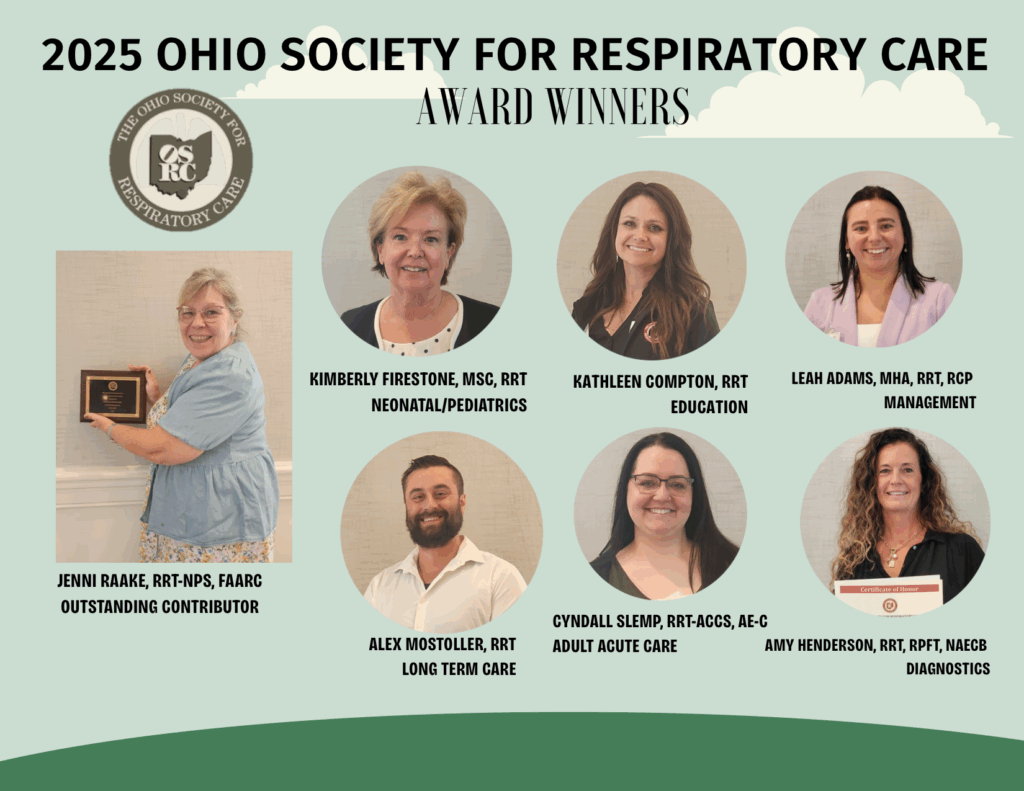 Please join us in congratulating these exceptional Respiratory Therapists, who by their dedication to the profession and our communities, have been honored by the Ohio Society of Respiratory Care as the practitioner of the year in their specialty category