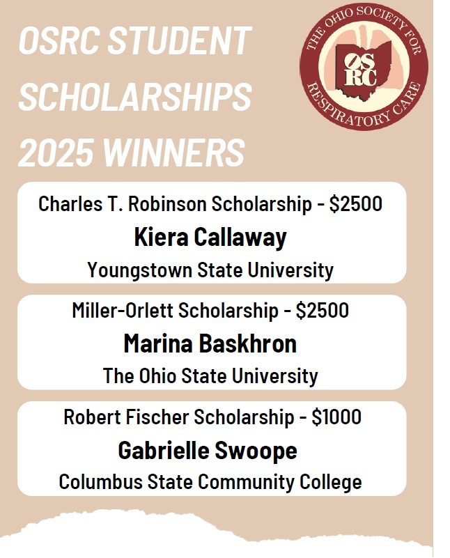 The OSRC will award up to three student scholarships, to Ohio residents, who are AARC members and maintain an average of 6 credit hours, in an Ohio CoARC accredited/provisional Respiratory Care Program.